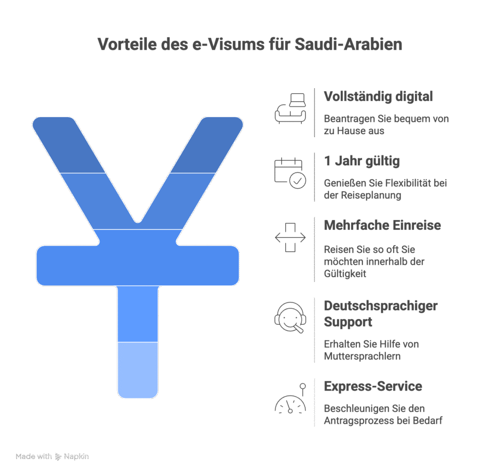 Mein Praxistipp: Das e-Visum ist wie eine Jahresflat für Saudi-Arabien. Einmal bezahlt, können Sie flexibel reisen. Perfekt für spontane Trips oder mehrere Geschäftsreisen.